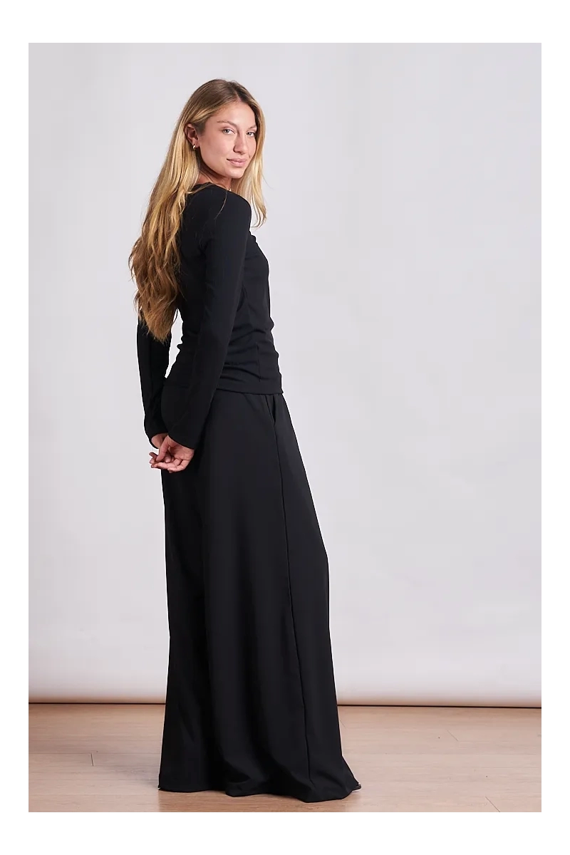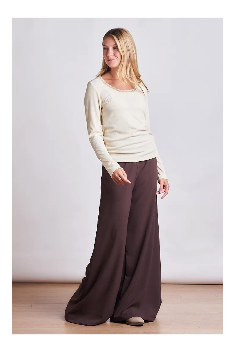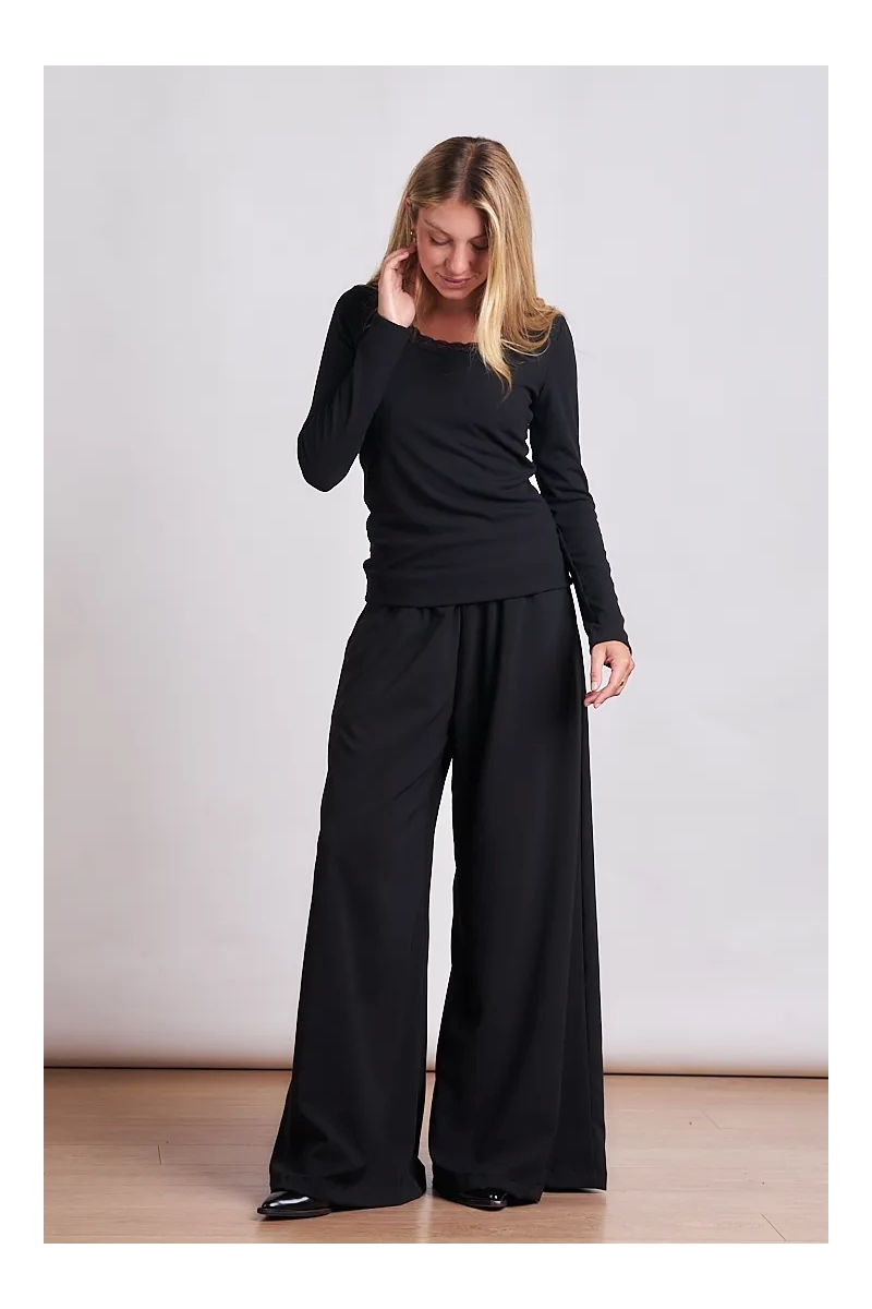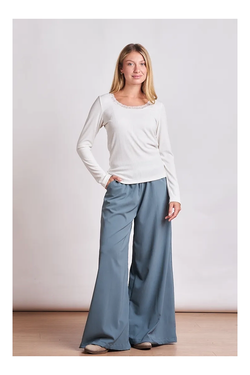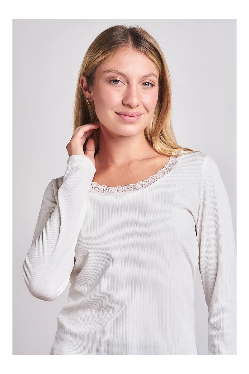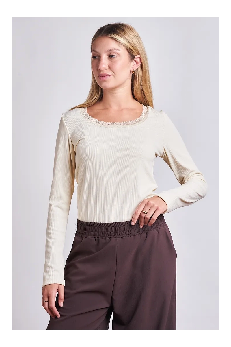 La base perfecta que toda clienta busca con un toque diferenciador. Esta remera de mangas largas está confeccionada en Morley Melbrone un tejido de punto acanalado con una caída suave y un ajuste que realza la figura sin ajustar de más. El detalle de puntilla delicada en el escote la transforma de un básico a una prenda femenina y sofisticada ideal para usar sola o debajo de blazers y cardigans. Curva de Talles Real: Disponible en 4 talles (S M L y XL) que aseguran un calce cómodo para diversos cuerpos facilitando la venta rápida.