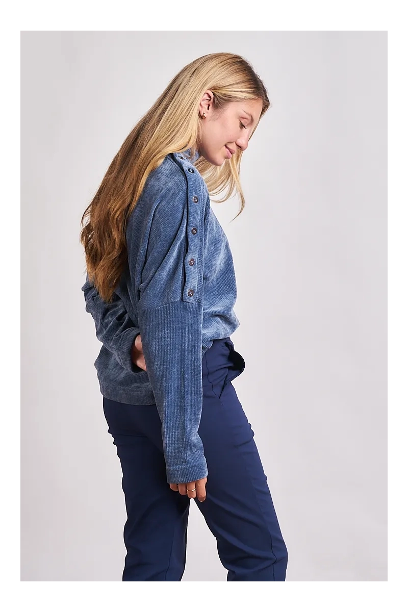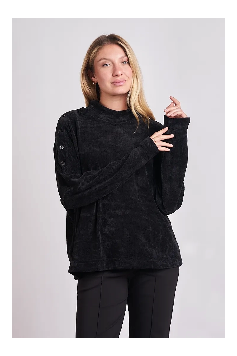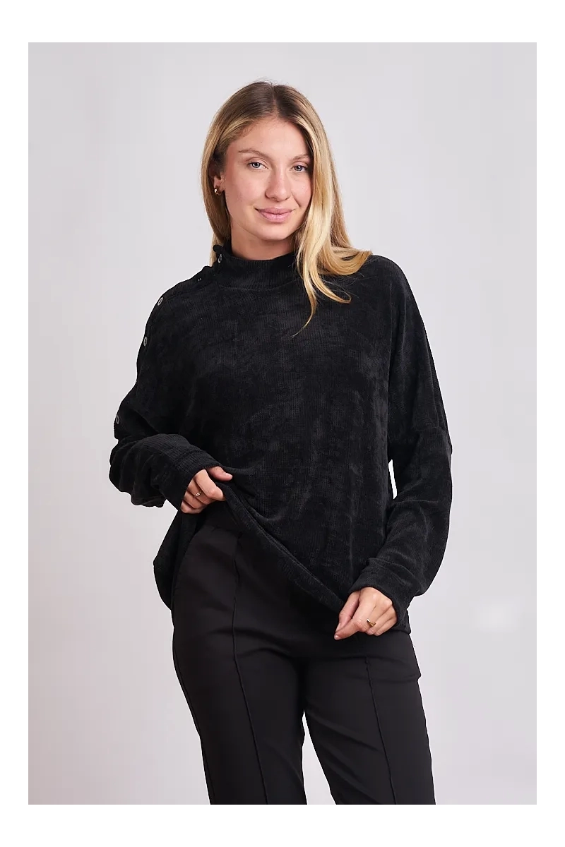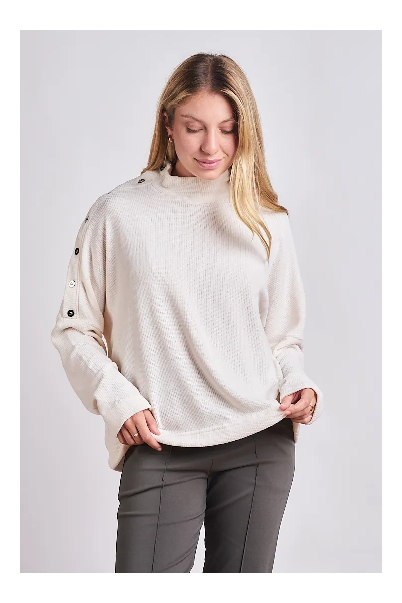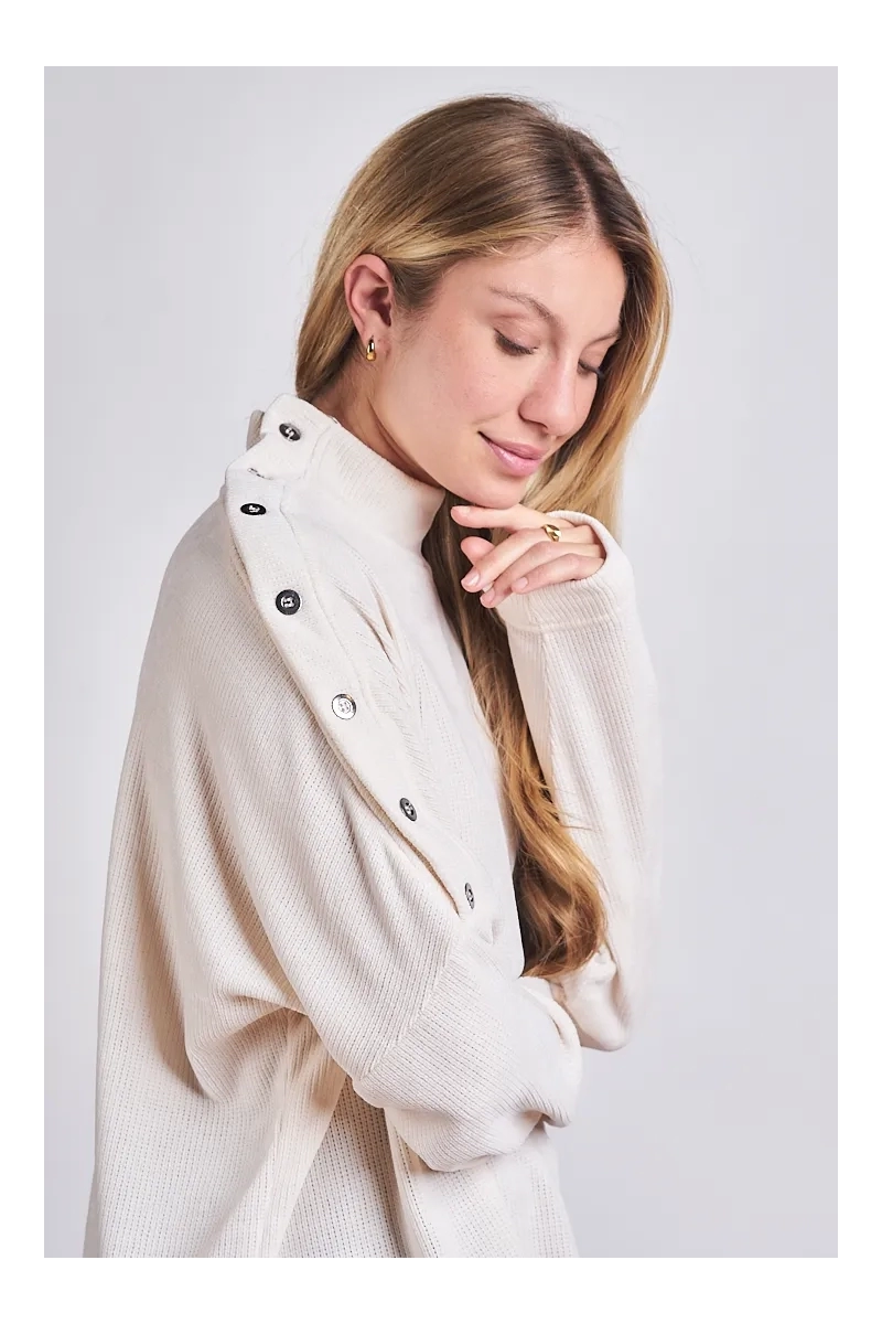 La pieza estrella de la temporada. Este sweater está confeccionado en Chenille de calidad superior un tejido que destaca por su brillo satinado y una suavidad que imita al terciopelo. Su diseño se distingue por una fila de botones de estilo náutico en uno de sus hombros un detalle de sastrería que aporta elegancia y un acabado diferenciador ideal para quienes buscan una prenda con personalidad. Es el punto focal de la prenda. Este accesorio metálico o de carey (según el tono) eleva el valor percibido permitiendo que el revendedor lo destaque como una pieza de diseño.