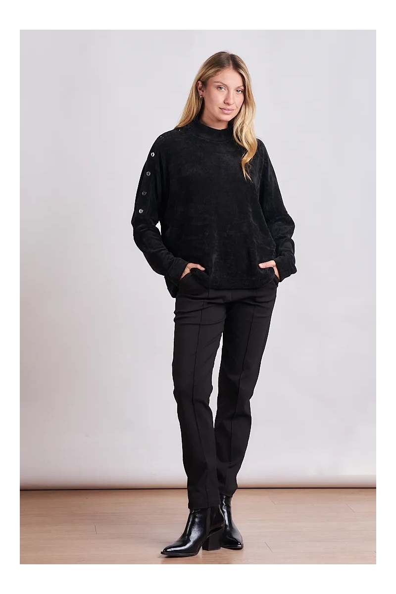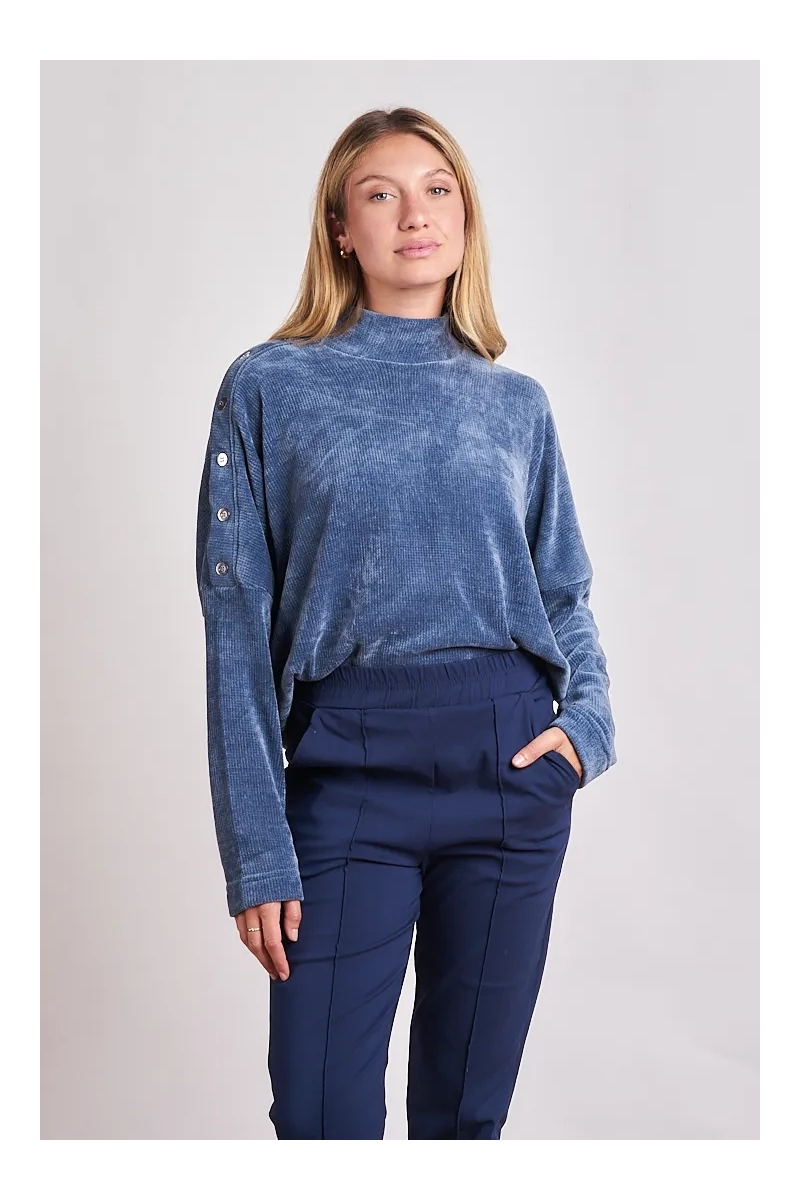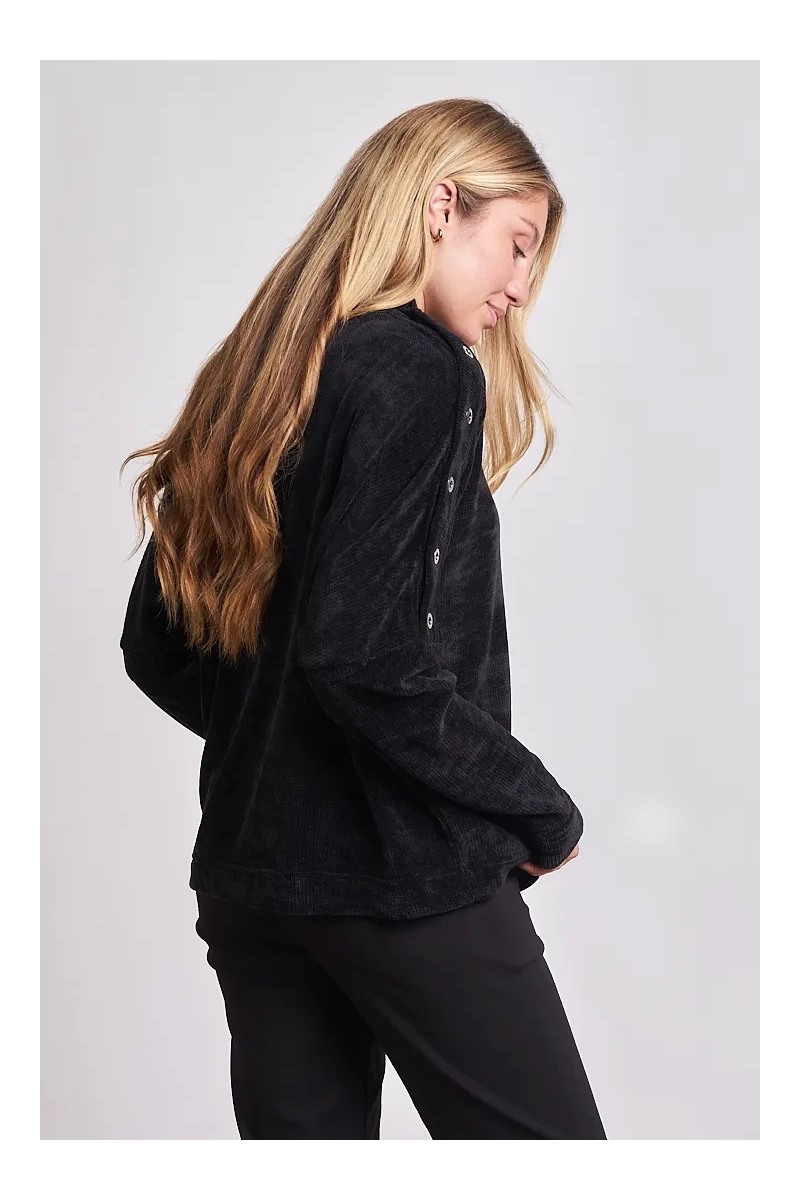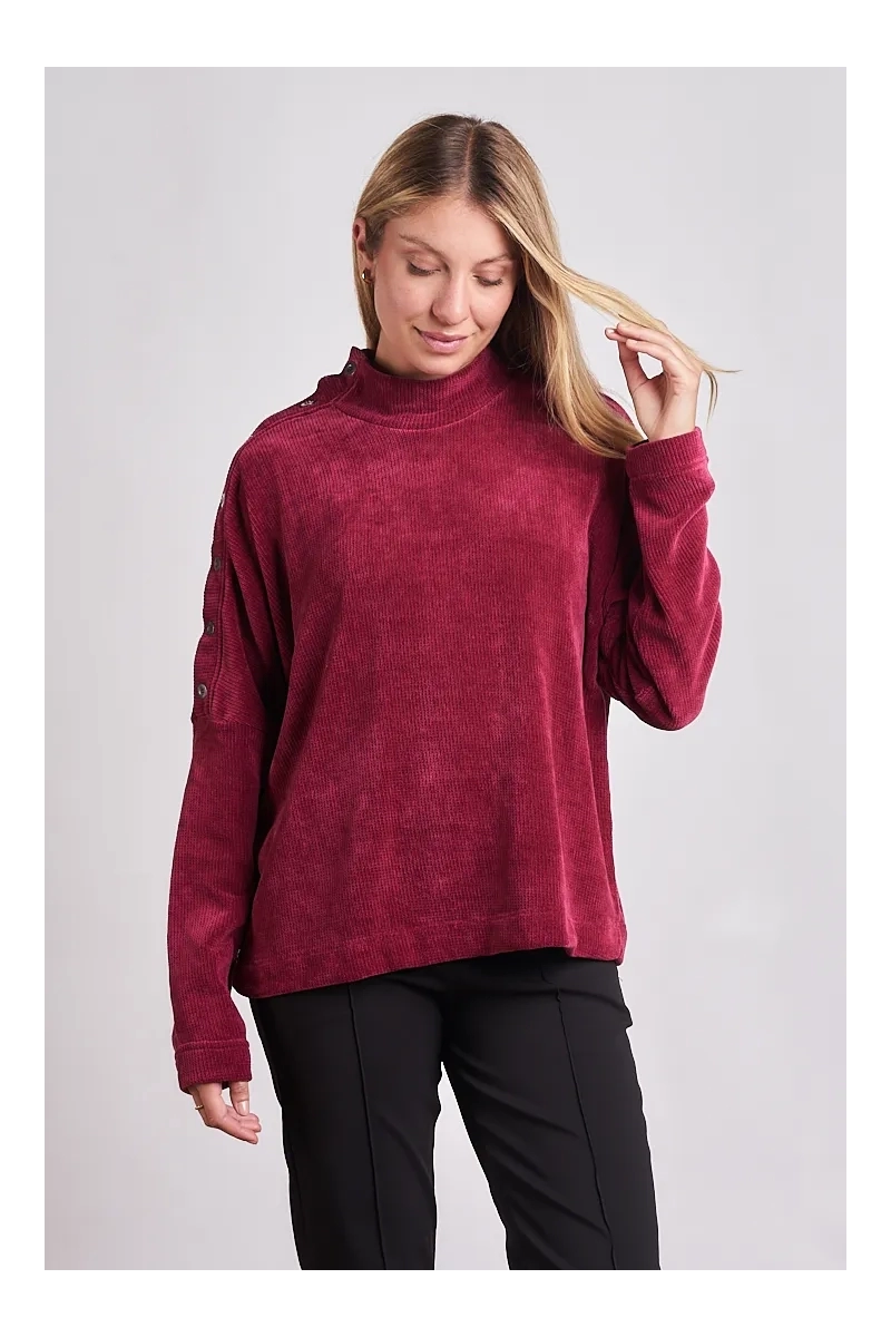 La pieza estrella de la temporada. Este sweater está confeccionado en Chenille de calidad superior un tejido que destaca por su brillo satinado y una suavidad que imita al terciopelo. Su diseño se distingue por una fila de botones de estilo náutico en uno de sus hombros un detalle de sastrería que aporta elegancia y un acabado diferenciador ideal para quienes buscan una prenda con personalidad. Es el punto focal de la prenda. Este accesorio metálico o de carey (según el tono) eleva el valor percibido permitiendo que el revendedor lo destaque como una pieza de diseño.