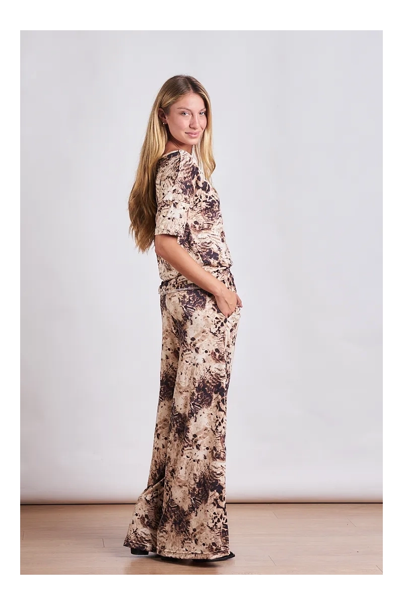 Fluidez diseño y comodidad total. Este palazzo está confeccionado en Super Soft un textil premium que se destaca por su caída elegante y su tacto sedoso. Su diseño de piernas anchas aporta un aire sofisticado y relajado a la vez mientras que sus estampas exclusivas lo convierten en la pieza central de cualquier outfit de temporada. Lo más importante: este palazzo está diseñado específicamente para hacer match con la Remera en Ribb Brush Estampado creando un total look que es un éxito de ventas asegurado.